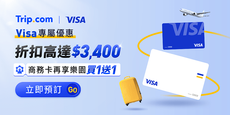 TRIP即日起至 2025 年 9 月 30 日,於每月 25 日 至 30 日月底救星活動期間輸入優惠代碼並刷 Visa 卡,享機票、飯店滿額現折優惠,刷 Visa 商務卡再享樂園買1送1。