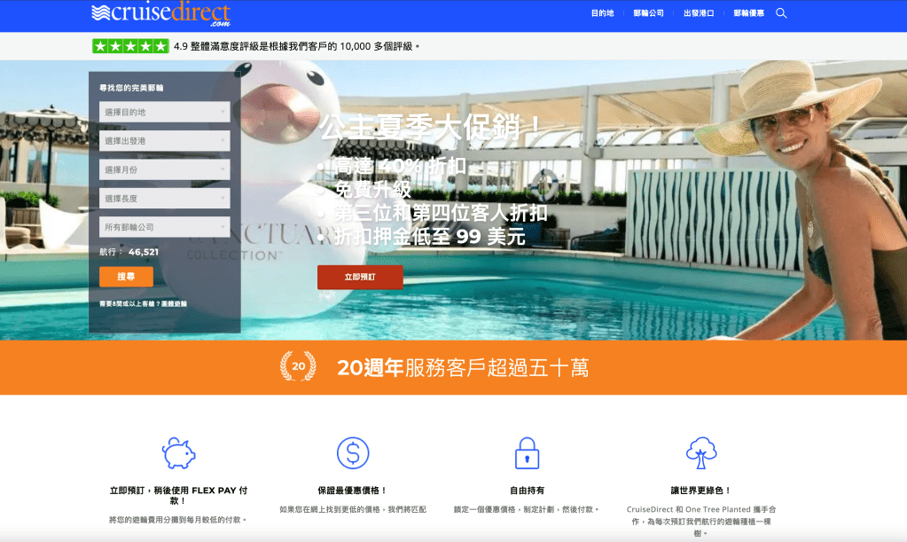 - 網站介面清晰,搜尋功能強大,能依照地點、日期、郵輪品牌等篩選。