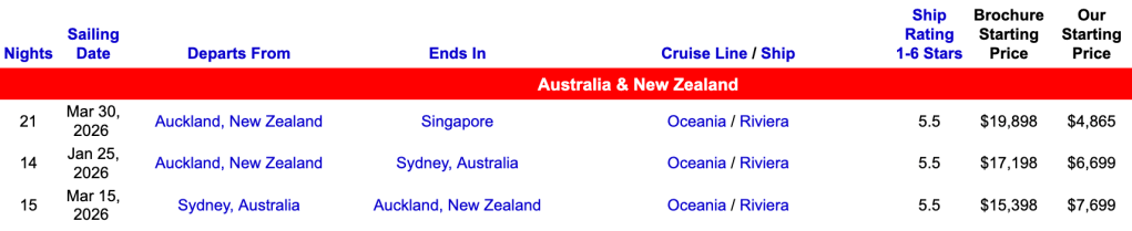 | 澳洲/紐西蘭單程探索航線 | Norwegian (NCL挪威郵輪) 提供13晚澳洲雪梨單程到奧克蘭/奧克蘭到雪梨的航線,中途停留塔斯馬尼亞及墨爾本,並深度旅遊紐西蘭南島嶼北島。 |